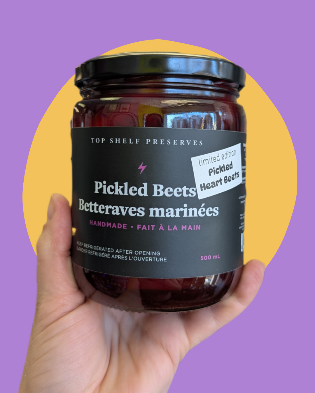 Limited edition Heart Beets! Our famous Pickled Beets, sliced and cut into heart shapes. Bold, sweet, and tangy. Available while supplies last. 500 mL