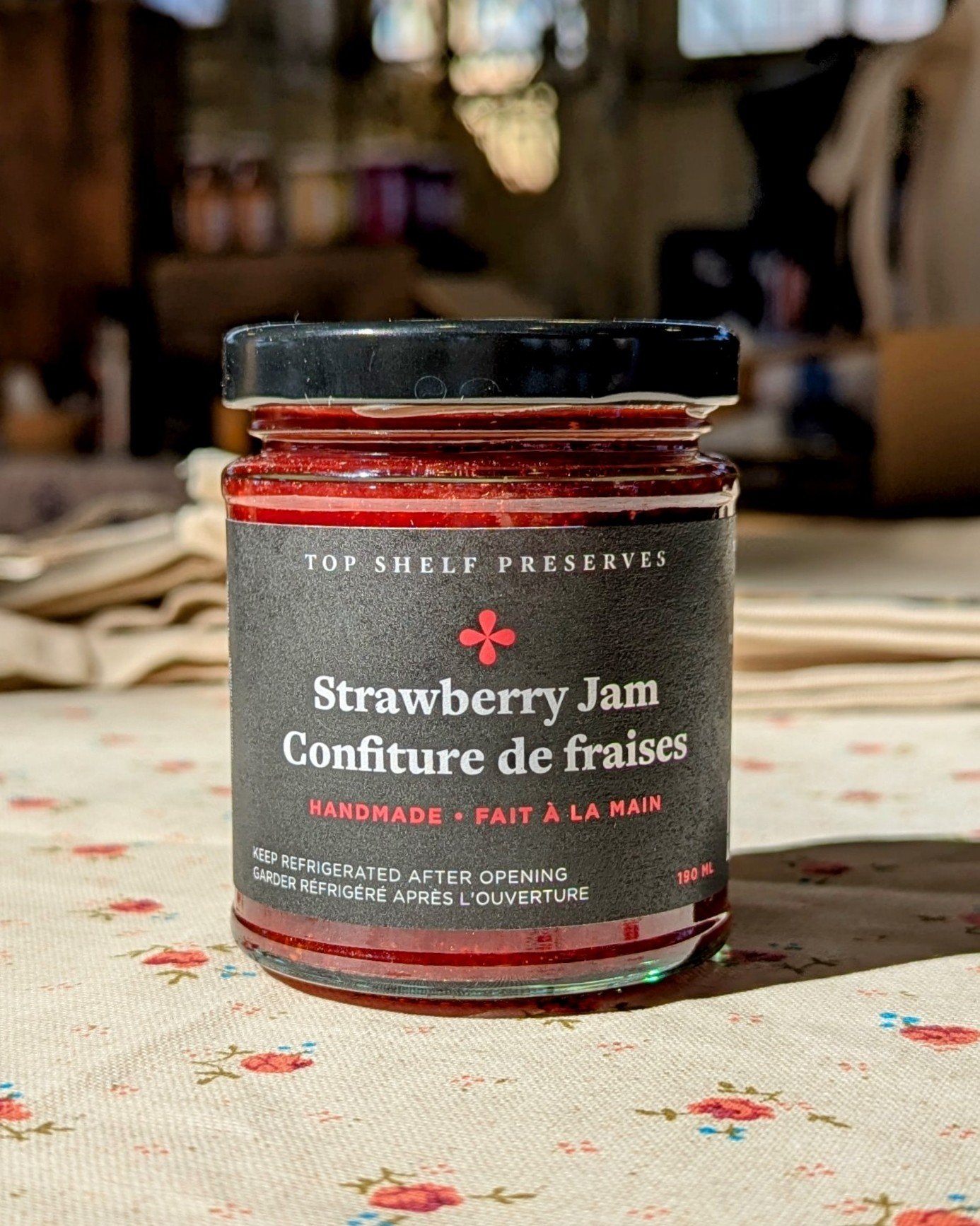 Classic comfort. Old fashioned strawberry jam with a heady berry aroma, lemony brightness, and a balanced sweetness befitting of this classic flavour. Picture this jam oozing over hot buttered toast. It’s also a lovely topping for overnight oats or a yogurt bowl. Made with Ontario strawberries.
